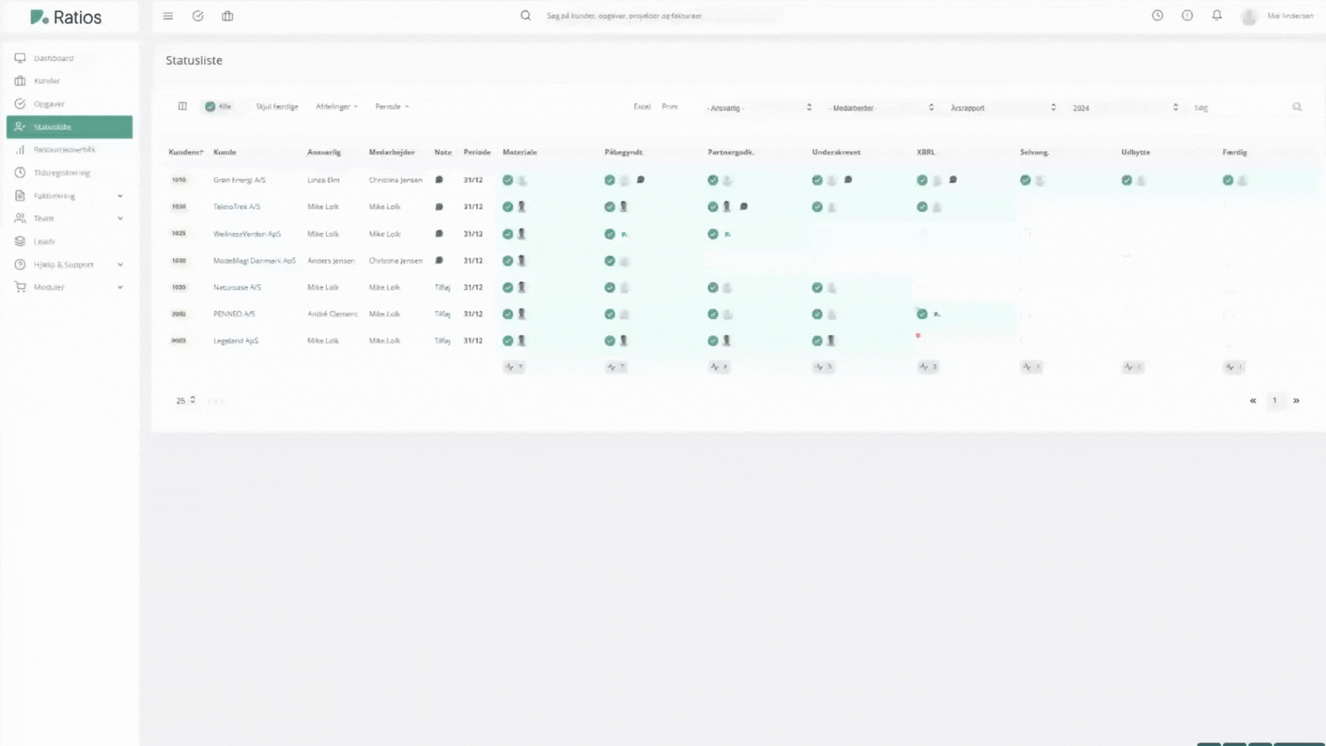 Udover at tilbyde et samlet overblik over alle klientopgaver, kan modulet også filtrere og præsentere statusliste oplysninger på en opgaveorienteret måde, hvilket gør det muligt for revisorer at fokusere deres indsats der, hvor det er mest nødvendigt. Det kunne være fremskridt over alle 31/12 årsrapporter (hvor mange mangler, etc.).